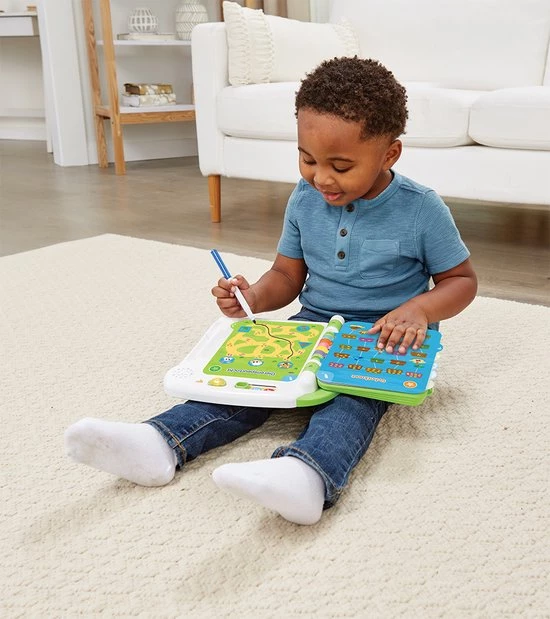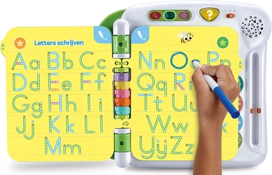 Klaar voor school? Met dit activiteitenboek leren kinderen spelenderwijs het alfabet, woorden, cijfers, kleuren, vormen, rijmen, logica en nog veel meer! Druk met je vinger op de interactieve bladzijden om te spelen of gebruik de bijgesloten uitwisbare stift om letters te leren schrijven, vormen over te trekken of om leuke tekeningen te maken. Druk op de hint-toets voor tips tijdens het spelen.