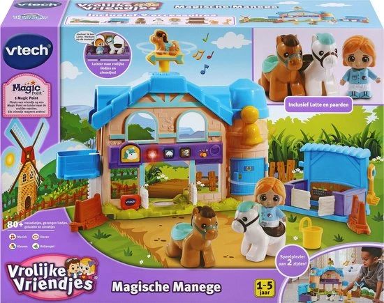 Ga op avontuur met lotte en haar paarden! Speel rollenspellen met Lotte, twee paardjes en 7 andere accessoires. Plaats Lotte of een ander Vrolijk Vriendje (apart verkrijgbaar) op het Magic Point om vrolijke reacties en 5 gezongen liedjes te horen. Druk op de paard-toets om interessante paardenweetjes, grappige geluiden, korte melodietjes en liedjes te horen.