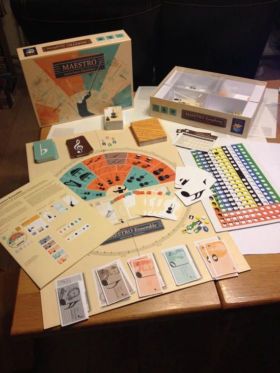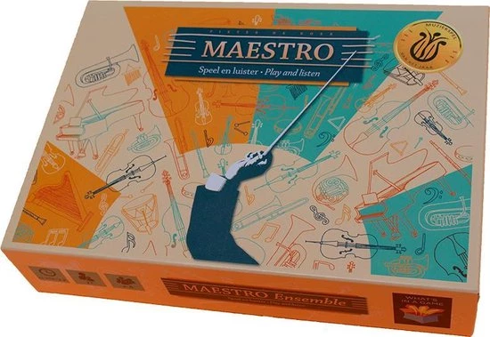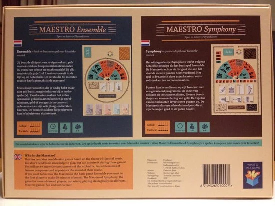 | Verpakkingsinhoud | Tweezijdig, speelbord., ca., 500, speelkaarten., Handleiding, (Nederlands-, en, Engelstalig)., Via, QR-code, zijn, muziekfragmenten, te, beluisteren, op, de, bijbehorende, website, maestromusic. |
