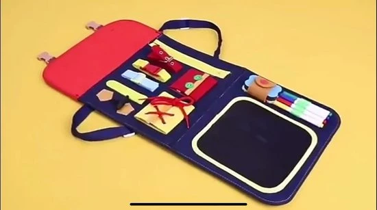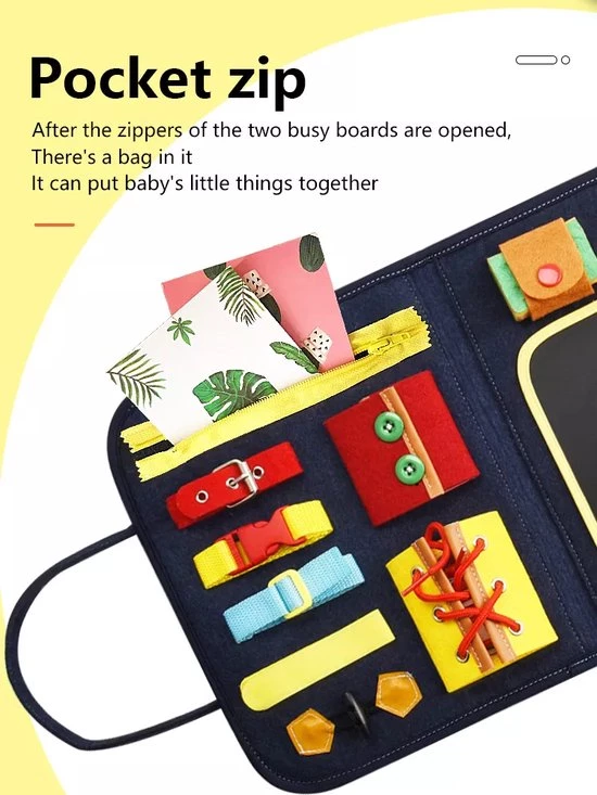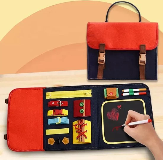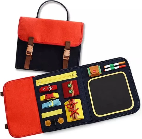 Met het activiteitenbord van Zain&Zaki zorg jij ervoor dat je kleintje spelenderwijs verschillende vaardigheden leert. Zowel voor thuis als onderweg kan je kind zich vermaken met 14 verschillende activiteiten. Het activiteitenbord is makkelijk in te klappen en kan als een rugzak gedragen worden, extra leuk voor je kind!