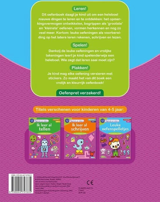 Dit oefenboek daagt je kind uit om een heleboel nieuwe dingen te leren en te ontdekken: het opmerkingsvermogen ontwikkelen, begrippen als ‘grootste’ en ‘kleinste’ oefenen, vormen herkennen en nog zo veel meer. Dankzij de speelse oefeningen en leuke tekeningen leert je kind spelenderwijs een heleboel. Bovendien zitten er stickers bij waarmee uw kind de oefeningen kan versieren. Zo maakt het van dit boek een vrolijk en kleurrijk oefenboek!